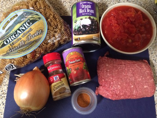 - Sauté onion and ground beef in a large pan with a little olive oil until meat is browned.