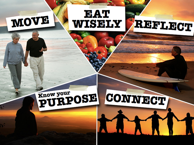 It is definitely worth 20 minutes of your time to watch this video.  But, if you cannot, Garr Reynolds summed up the longevity secrets onto one slide: